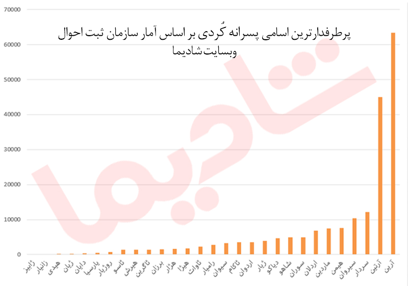 در زیر نموداری برای شما آورده ایم که در آن بر اساس آمار سازمان ثبت احوال، 20 اسم کردی پسرانه که بیشترین میزان انتخاب دارند را به صورت نموداری می توانید ببینید.